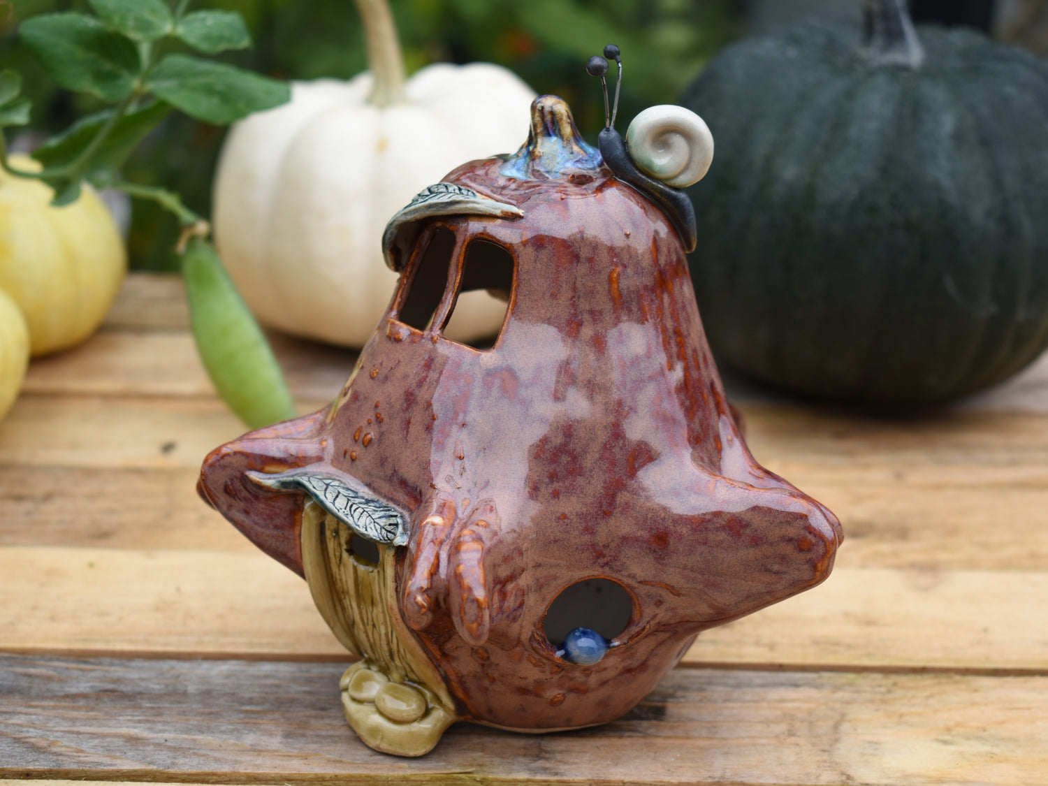 The tradition to make plaster molds from real pumpkins started in 2023. I'm planning to continue this tradition for the forseeable future, expanding with a new plaster mold every fall. With the plaster molds, I can slipcast the ceramic pumpkins, allowing me to create shapes that I wouldnt be able to make on a potter's wheel. This year, I turned a couple of pumpkins into little fairy houses.